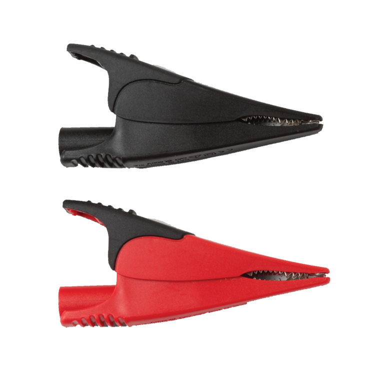 - Um par (vermelho, preto) de clipes jacaré grande com mandíbulas de aço niquelado